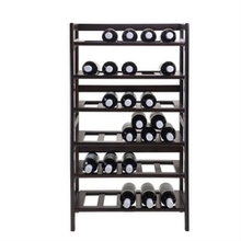 This 34-Bottle Wine Rack in Dark Brown Walnut Wood Finish, is ideal to display your wine collection or to keep in your wine storage area. 6 tiers can hold a max of 54 bottles. Each tier can hold bottles in single row of 5 or you can pyramid stack to hold 9 per shelf. Wood construction with solids and composite woods with a beautiful walnut finish. Dimensions: 21.5W x 11.5D x 38.5H inches. Product dimensions: 18 lbs. Assembly required.