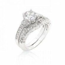 Genuine Rhodium Plated Classic Art Deco Engagement Ring Set with Round Cut Clear Cubic Zirconia Centerpiece and Pave Set Round Cut Clear Cubic Zirconia Outer Casing Polished into a Lustrous Silvertone Finish. Channel your inner 20s heroine with this beautiful Round Cut Bridal Ring Set fashioned in a gorgeous Art Deco design and glimmering light catching stones. Our genuine rhodium finish is achieved using an electroplating process that coats the item with heavy layers of rhodium a close cousin of platinum that costs three times as much which gives our jewelry a platinum luster.