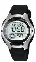 Stainless Steel Case Dual time, 1/100 second stopwatch with elasped time, split time, 1st-2nd place, Daily alarm, Hourly time signal, 12/24 hour formats, Auto calendar, Battery life 10 years, Black Resin Band