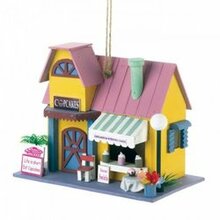 Life is short so eat cupcakes! Fully functional birdhouse with one 1 1/4″ hole, invites nesting birds in and keeps larger ones out. Brightly painted in pink, yellow and blue, this bakery birdhouse will stand out for those with a sweet tooth!