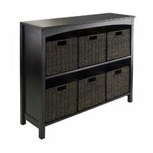 This spacious Espresso 3 Tier Bookcase Shelf Dresser with 6 Storage Baskets is ideal for displaying your treasures, storage, dresser, kids room, or your books. Simple and elegant design is a perfect additional to any home. Comes with 6 Corn Husk Foldable Baskets to create a new function and look for the shelf. Suitable and functional in every room.