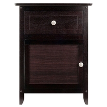 Tuck remote controls and drink coasters inside the drawer of this Espresso Wood End Table Nightstand Accent Table. With its clean lines, slightly tapered legs, and uncomplicated design, the table fits easily into traditional and more modern interiors alike. Set the table next to a sofa in the living room, or use as a night stand with a lamp placed on top. The table is crafted out of wood/composite with a warm espresso finish. For storage, the table offers a small drawer and a single-shelf cabinet. Both the drawer and the cabinet door provide a round satin nickel knob for opening and closing; the cabinets hinges are pre-installed on the right side of the door to swing open from left to right only. Upon delivery, the table requires home assembly and comes with necessary hardware and tools. The assembled table measures 19 inches wide by 15 inches deep by 25 inches high. This item weighs 21 pounds upon shipping.