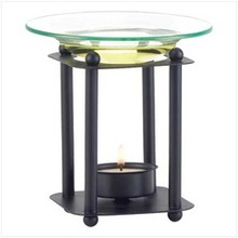 Four slender matte-black columns stylishly support a shallow glass oil dish; a tealight gently warms your favorite oil to disperse a subtle fragrance. Simple, contemporary styling is a fabulous fit for any décor! Metal with glass dish. 3 7/8″ diameter x 4 1/2″ high. Tealight and oil not included.