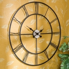 The classic design of this Oversized 30-inch Black Wall Clock with Roman Numerals adds a dramatic accent to any wall. This clock features a Roman numeral face, see through sculpted design, and a black powder coated finish. Its silver finished center provides a finishing focal point to this beautiful, yet functional home accent.