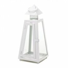 This candle lantern is alluring set on a tabletop or hanging from its top loop. The white finish lends itself to being equally at home in a modern setting as it is in a charming cottage or bungalow. Item weight: 1.6 lbs. 5″ x 5″ x 11 1/2″ high; 12 5/8″ high with handle. Iron and glass. Candle not included. UPC: 849179017606.